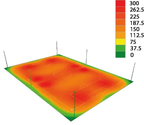 Esta simulación muestra cómo se distribuye la luz en una pista de pádel exterior equipada con 8 luminarias LED de 150 W.